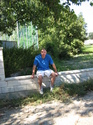 Koen sitting on the wall of the yellow house